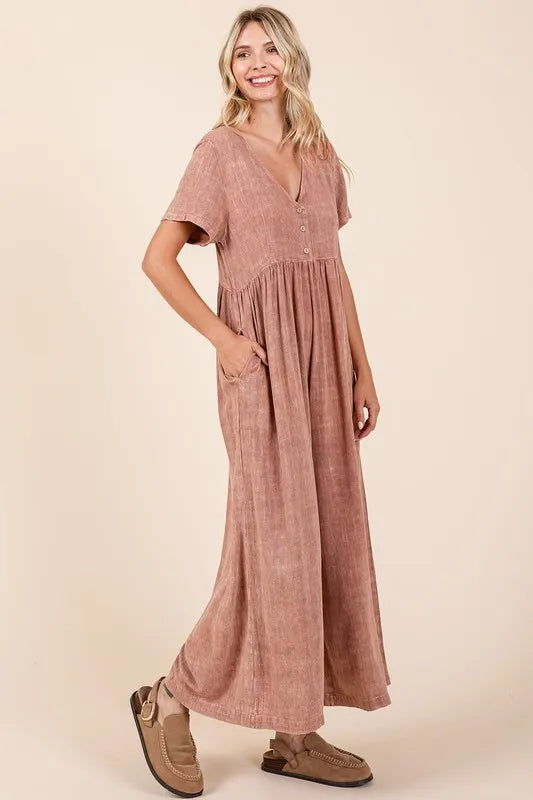 Mittoshop Mineral Wash Short Sleeve Flowy Wide Leg Jumpsuit